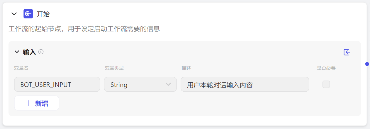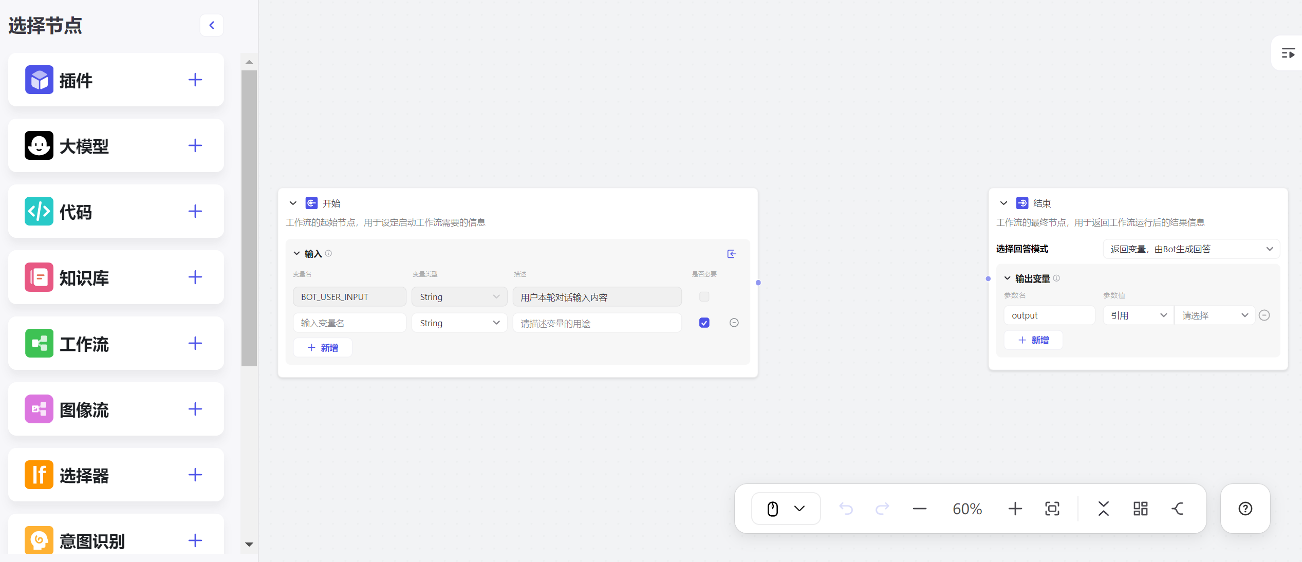 进入Coze主页后依次点击 个人空间→工作流→创建工作流 就可以创建一个新的工作流了。新工作流会包含一个开始节点和一个结束节点,对应模型的输入和输出。