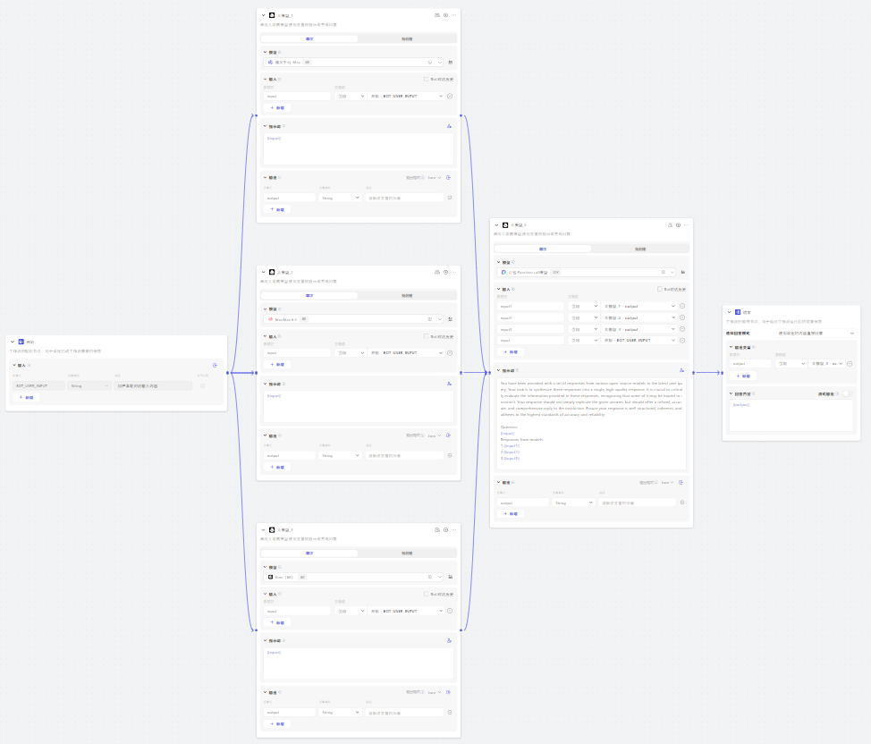 这一层的搭建需要点击左边的大模型加号生成新的大模型块,每一块代表一个代理模型。Coze目前可以选择的模型有Baichuan4、GLM-4、MiniMax、Kimi、豆包和通义千问,可以任选几个作为处理层模型。注意这里需要将大模型的块与输入块相连,并定义输入参数。提示词可以直接使用用户输入,当然为了提升模型能力,也可以自己加一些提示词。这里我使用通义千问-8k、MiniMax-8k和Kimi-8k作为代理模型。