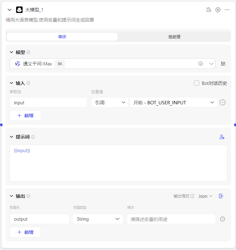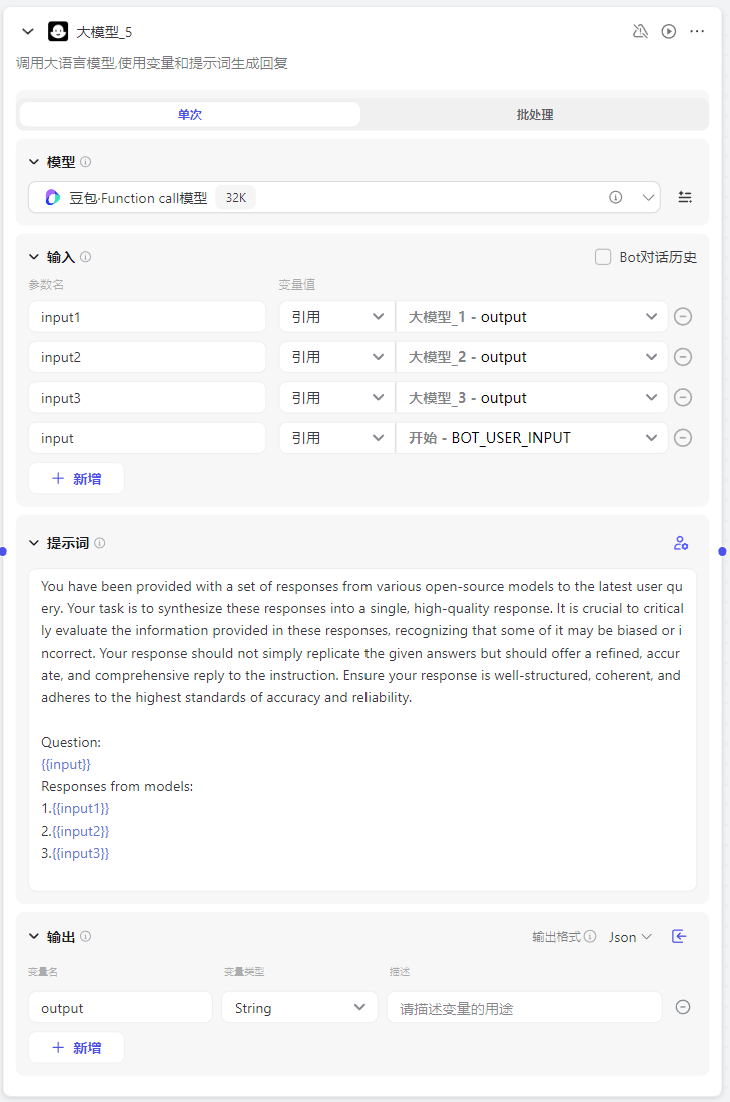 这一层也是采用大模型块,但只有一个模型,这里我选择豆包-fc-32k模型作为协作模型。需要注意的是要把该模型块与上一层模型全部相连,并定义好前面每个模型的输出对应的变量。这里我还额外添加了用户输入作为变量。