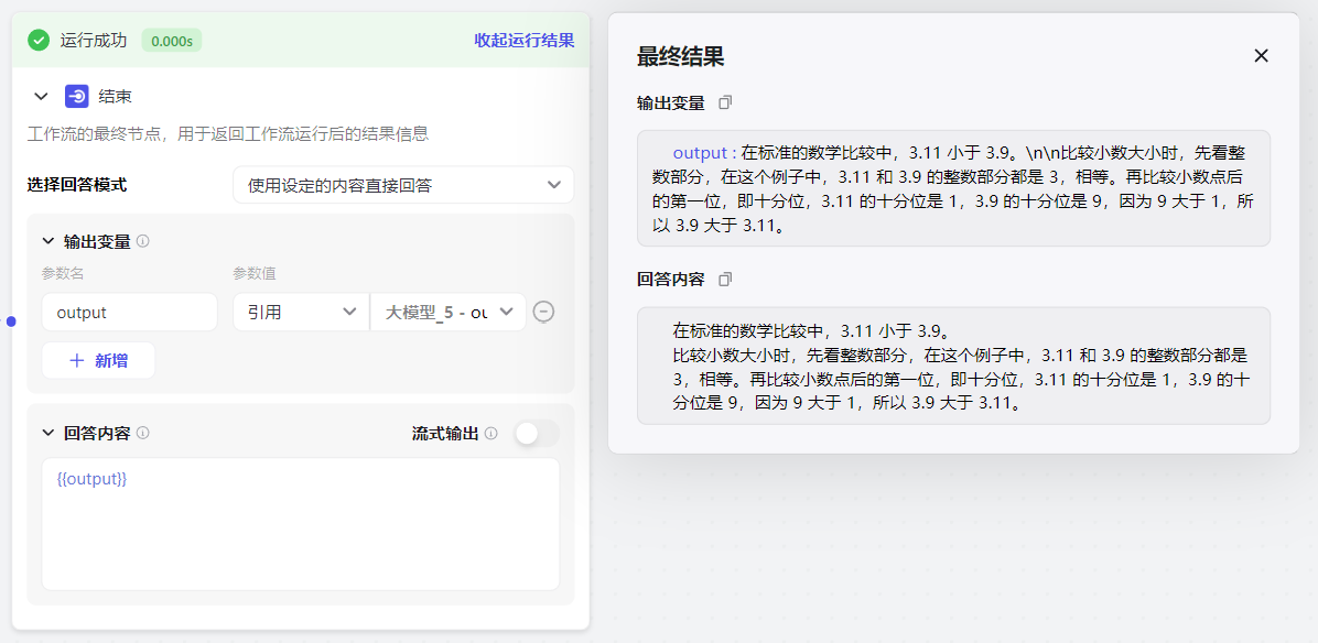 这里简单测试一下。测试问题是:3.11为什么大于3.9?问题比较简单,MoA成功答对了,但整体运行耗时11s。运行速度可能是MoA最大的缺点了吧。